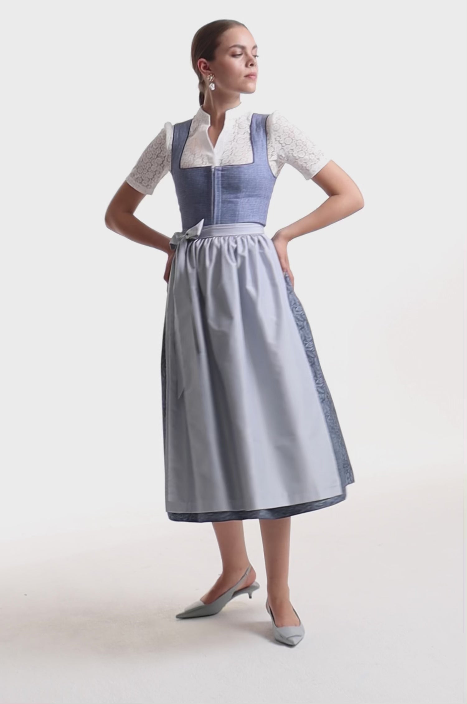 Das Leinenmieder verleiht dem Dirndl eine hochwertige, authentische Ausstrahlung. Der 80 cm lange Rock fällt weich und zeigt ein dezentes Muster, das den Ton-in-Ton-Look stilvoll unterstreicht. Der taillierte Schnitt sorgt für eine feminine Silhouette und eine moderne, klare Linie.