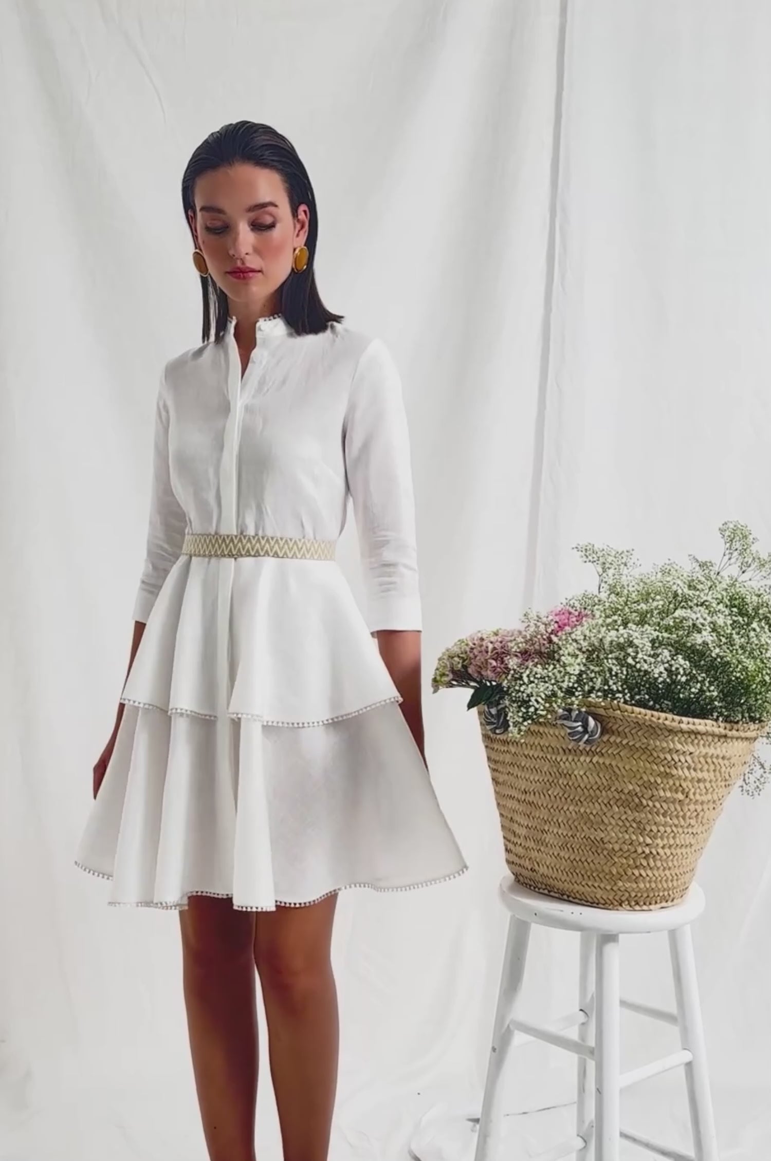 Das weiße Kleid Mica. Eine durchgehende verdeckte Knopfleiste. Der schwingende Rock ist in zwei Bahnen unterteilt und definiert einen luftigen und gleichzeitig eleganten Look. Das Kleid hat Ärmel in Dreiviertellänge.