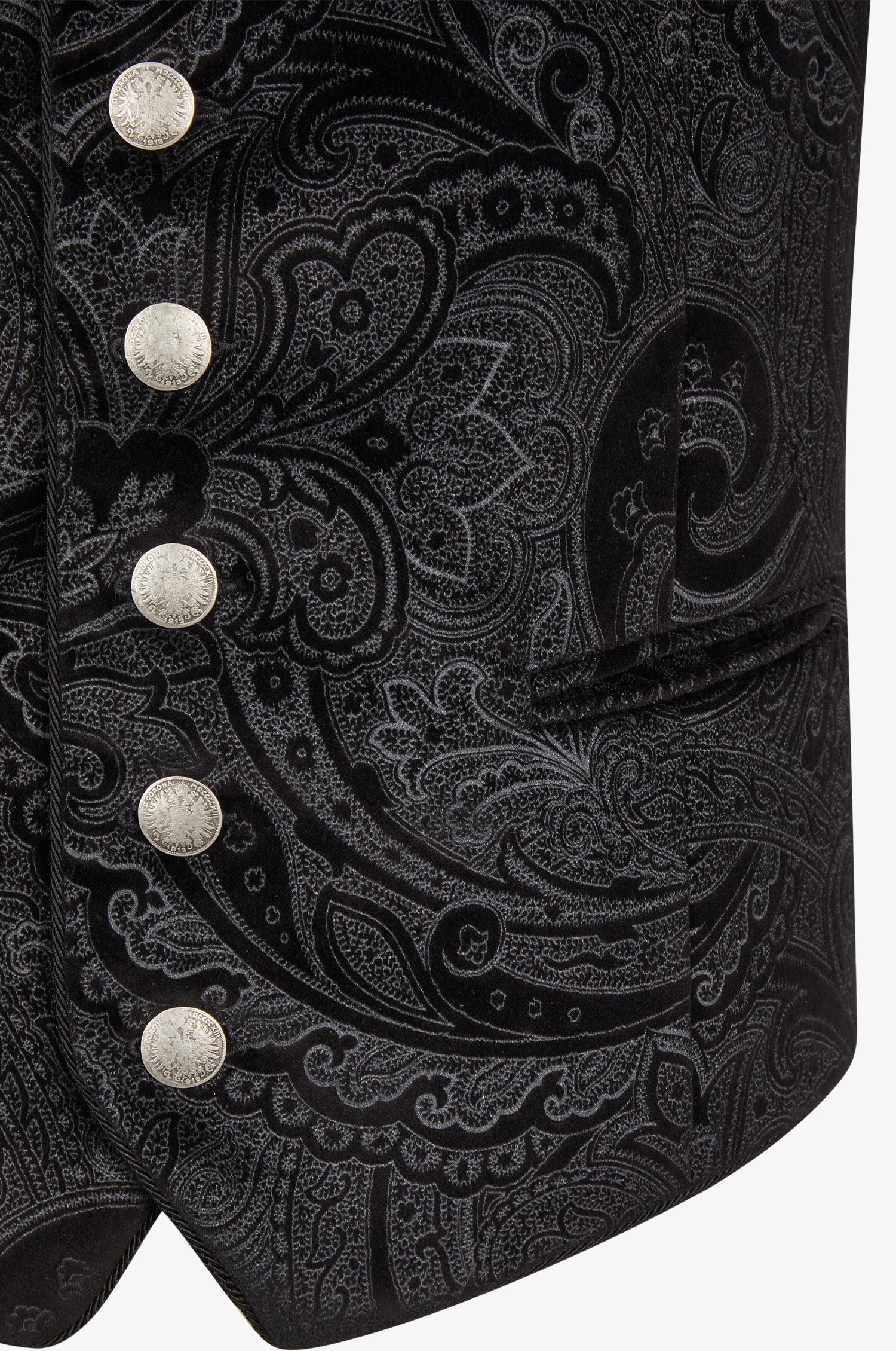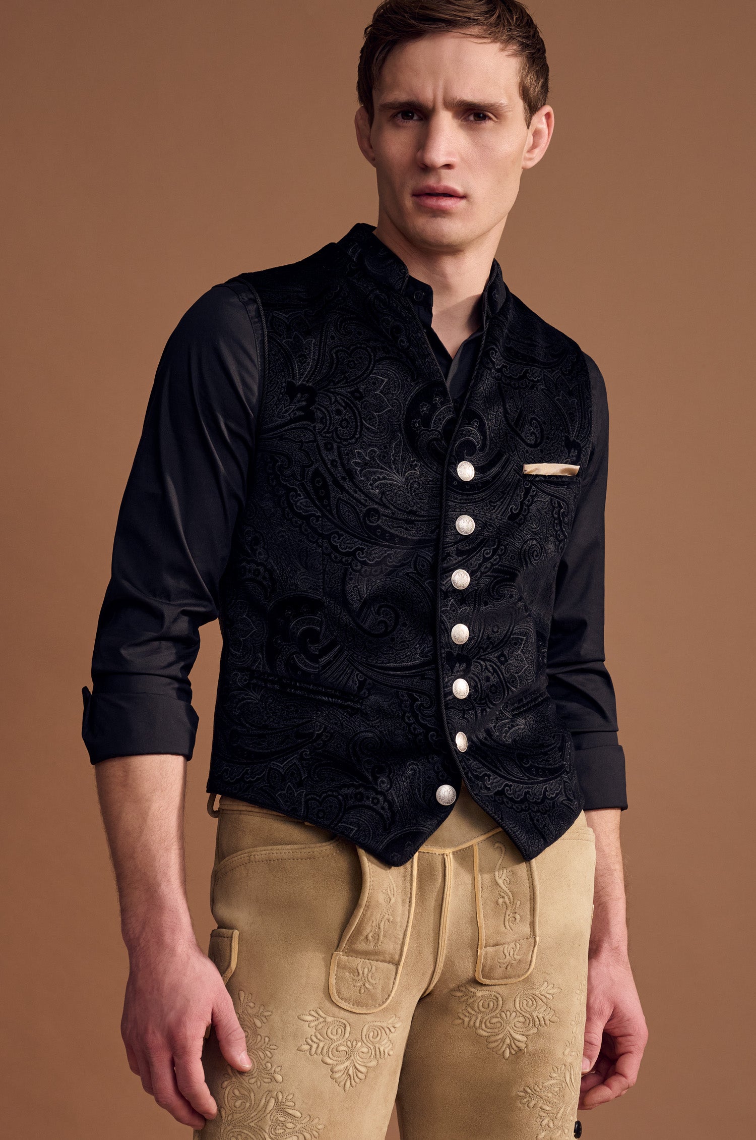 Die Trachtenweste Henry in Schwarz besticht durch ihr elegantes Samtmaterial mit feinem Ornamentmuster, das klassischen Charme und moderne Raffinesse vereint. Silberfarbene Knöpfe setzen edle Akzente, während die zwei praktischen Eingriffstaschen Funktionalität ergänzen. Diese Weste ist die perfekte Ergänzung für traditionelles Outfit mit stilvoller Note.